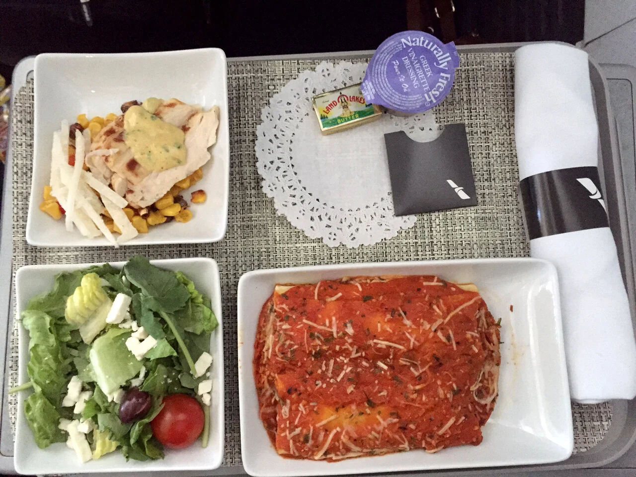 Real Dishware + Food. This may still look like typical airline food but I promise you it was better. Warm grilled chicken with a fresh greek salad and cheesy manicotti? Lean Cuisine this was not.